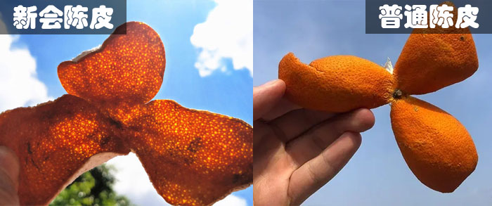 并不是所有的陈皮都叫新会陈皮!只有在新会生长的茶枝柑的皮制作的陈皮才能叫做新会陈皮,就算把茶枝柑移栽到别的地区,也只能做普通陈皮,这与新会地区的气候、水肥条件有关。新会陈皮三瓣相连、皮薄、香味足、油胞大且油点分布密集,富含营养物质高达24种。