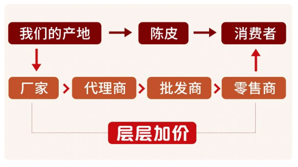 陈皮是“广东三宝”之一,都说“一两陈皮一两金”,近年来新会陈皮价格也居高不下。然而,陈皮虽贵,但真不至于您看到的那么贵!大家所了解到的陈皮价格往往就是门店的价格,从源头到门店,要经过原产地、批发商、代理商、零售商四个环节,价格层层加码早就超过它实际的价格,这也是为什么很多购买陈皮的叔叔阿姨一直觉得贵的原因了。